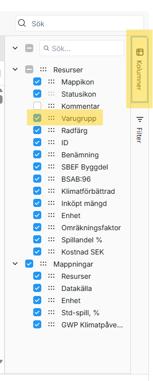 Kolumnen Varugrupp visar vilken produktkategori som varje resurs i ditt projekt tillhör. Detta är en kategorisering som BM använder för att koppla dina resurser till rätt klimatdata vid beräkningar. Du kan inte ändra den direkt eftersom kategoriseringen är kopplad till systemets mappning mellan resurser och generiska klimatdata.